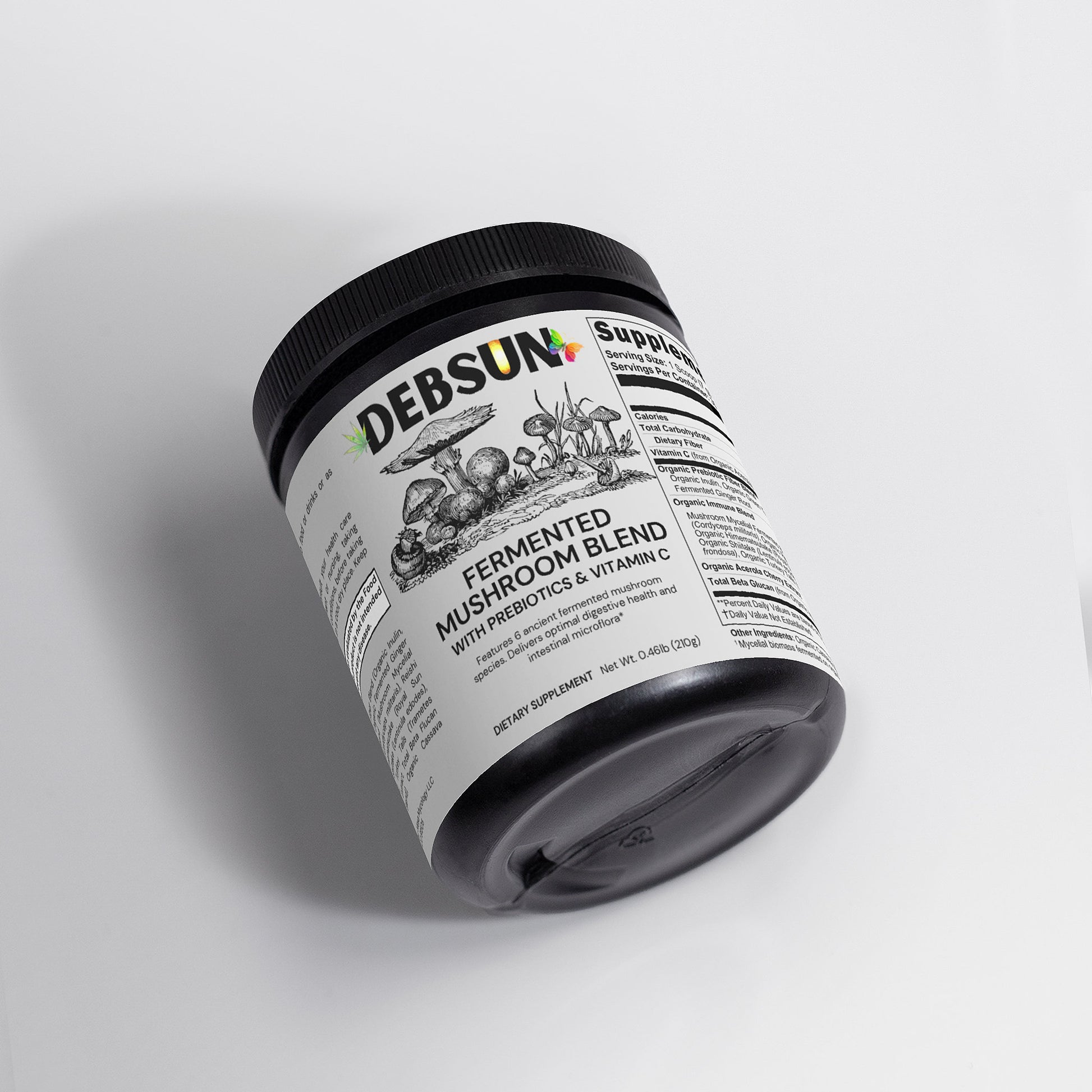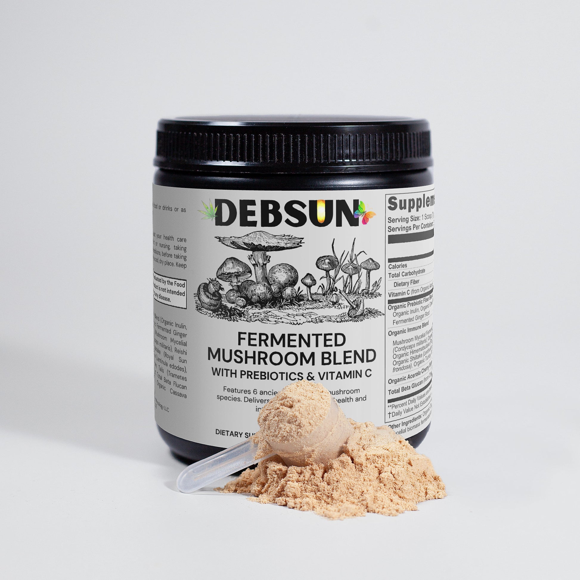 Ingredients: Vitamin C, Organic Prebiotic Fiber Blend (Organic Inulin, Organic Green Tea Extract, Organic Fermented Ginger Root), Organic Immune Blend (Mushroom Mycelial Biomass Blend,[Cordyceps (Cordyceps militaris), Reishi (Ganoderma lucidum), Himematsutake (Royal Sun Agaricus) (Agaricus blazei), Shiitake (Lentinula edodes), Maitake (Grifola frondosa), Turkey Tails (Trametes versicolor)], Acerola Cherry Extract, Total Beta Flucan (from Organic Immune Blend), Organic Cassava Maltodextrin