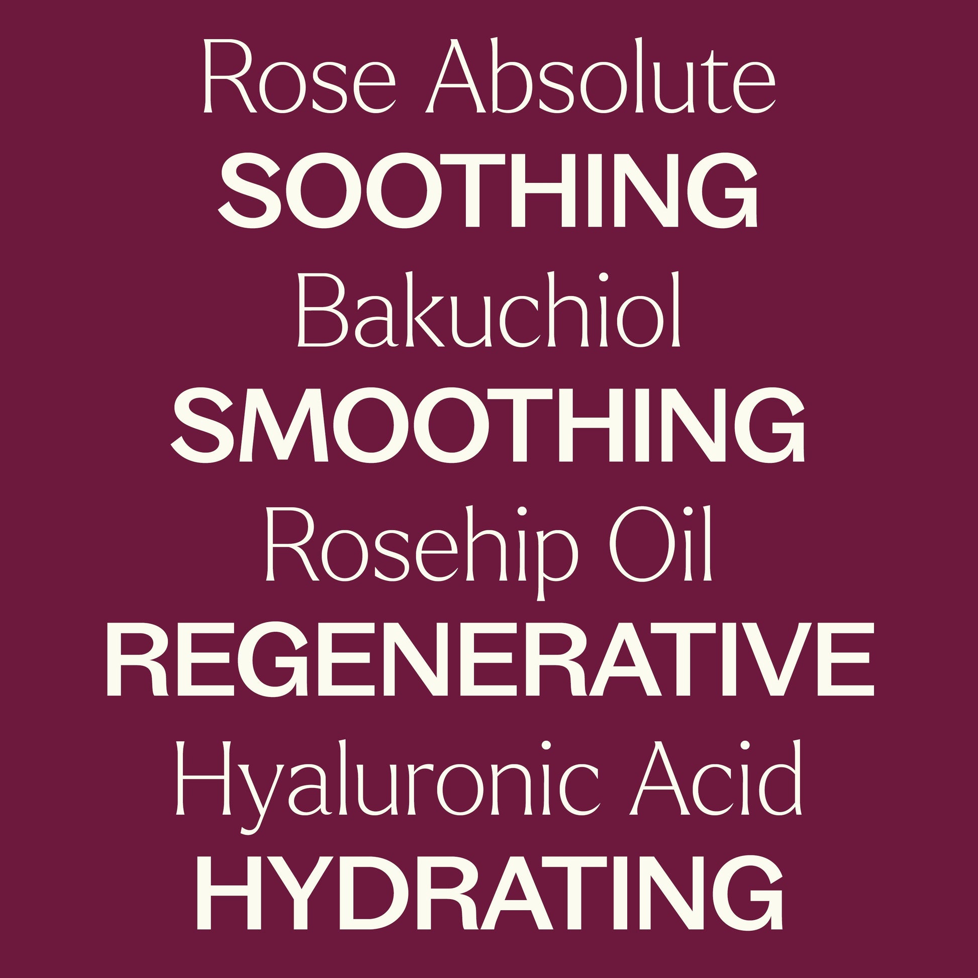 Rosehip Oil: Regenerative, hydrating, and softening, this carrier oil is made from the cold-pressed rosehips of the Rosa canina flower. It contains a high amount of vitamins E and A, along with essential fatty acids that promote collagen and elastin production, facilitates skin healing, and is considered an all-around treat for mature skin.